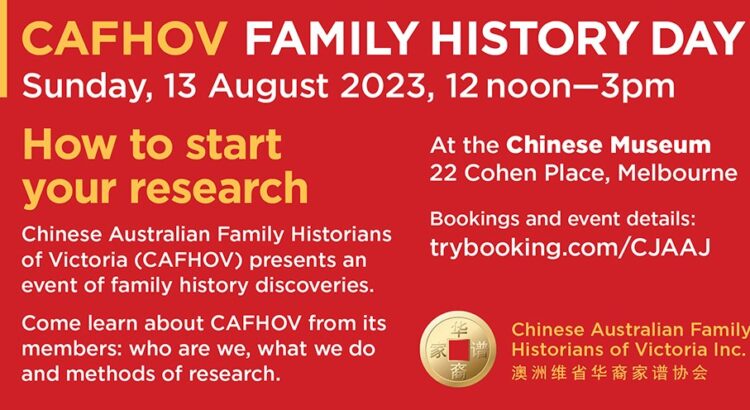Chinese Australian Family Historians of Victoria (CAFHOV) presented a day of family history discoveries. Learn about CAFHOV from its membership. Who are we, what we do, how we support family history research, and more.