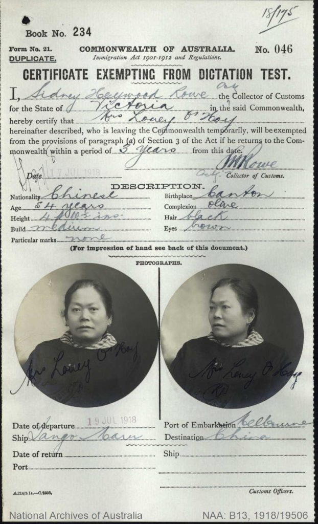 Colonial and then Commonwealth immigration restriction laws had a particular impact on people of Chinese and other Asian backgrounds. In particular, the Immigration Restriction Act, introduced in 1901, set out to limit the numbers of non-Europeans entering Australia. Its infamous Dictation Test could be applied to anyone entering the country, even if they were Australian-born or a naturalised British subject. Chinese who had a right of ‘domicile’ in Australia – such as Australian-born Chinese, naturalised British subjects, and those who met particular residency requirements – could apply before departure to be exempted from the Dictation Test…