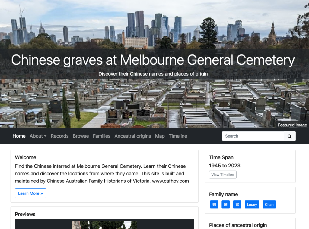 The Chinese Graves at Melbourne General Cemetery external website documents the graves of Chinese interred at the Melbourne General Cemetery and is continuously being updated by CAFHOV.